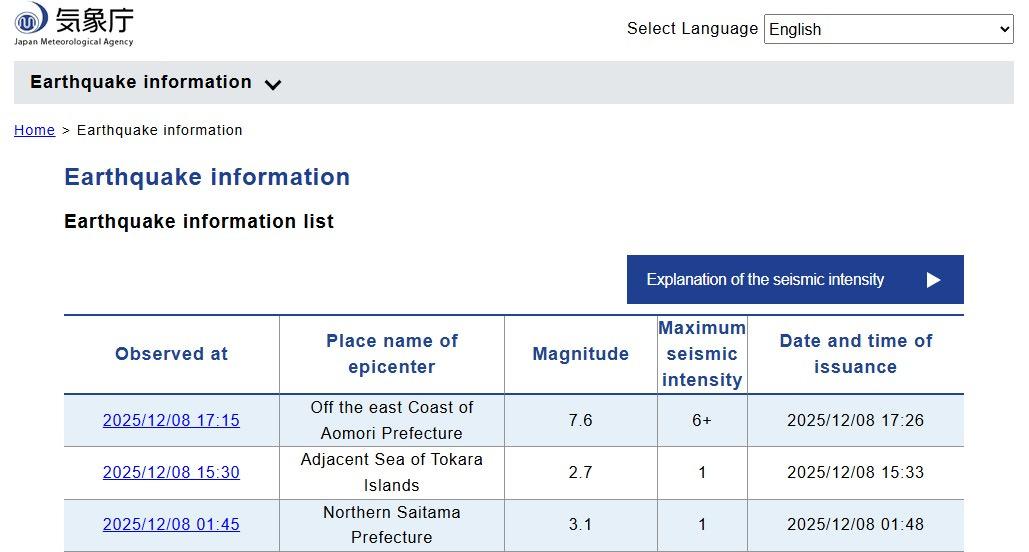 Japonya Meteoroloji Ajansı’nda 8 Aralık 2025 tarihinde Japonya’da gerçekleşen depremler şöyle yer aldı: