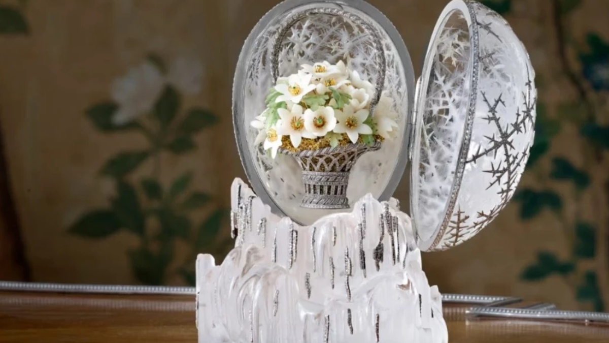 Kaya kristalden yapılan bu yumurta, buzla kaplı bir görünüme sahip. Yumurtanın dış yüzeyinde platinden yapılan kar motifleri ve elmaslar bulunuyor. İçinde ise beyaz kuvars ve anemon çiçekleriyle doldu bir sepet yer alıyor.