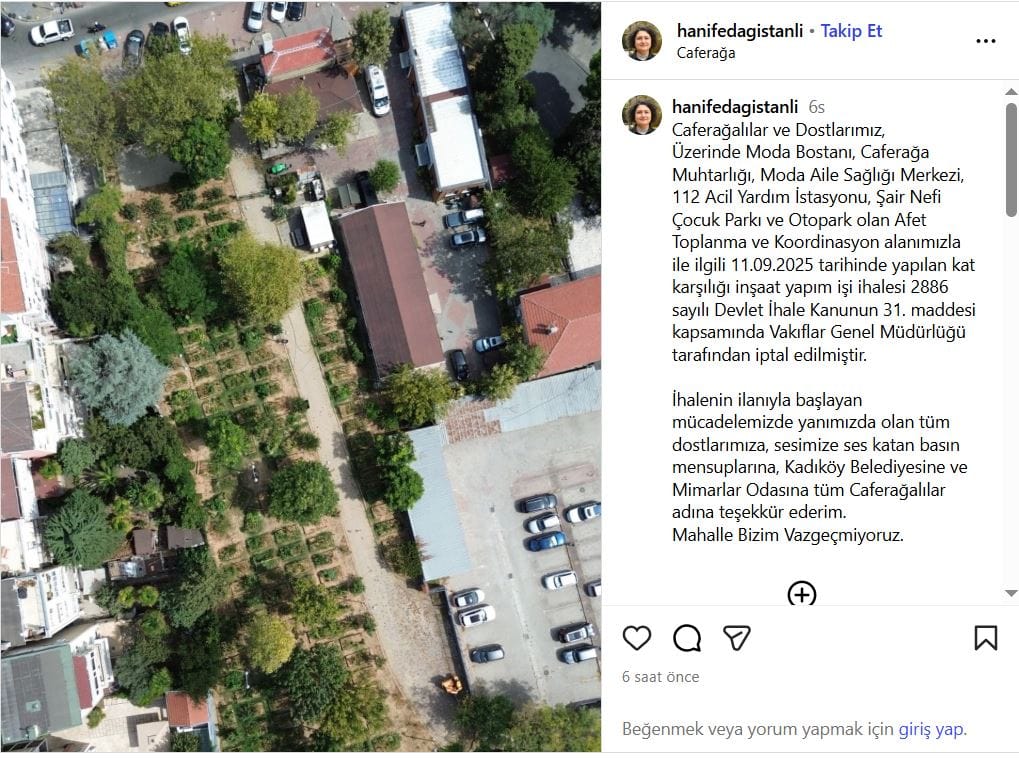 • “Üzerinde Moda Bostanı, Caferağa Muhtarlığı, Moda Aile Sağlığı Merkezi, 112 Acil Yardım İstasyonu, Şair Nefi Çocuk Parkı ve Otopark olan Afet Toplanma ve Koordinasyon alanımızla ile ilgili 11.09.2025 tarihinde yapılan kat karşılığı inşaat yapım işi ihalesi 2886 sayılı Devlet İhale Kanunun 31. maddesi kapsamında Vakıflar Genel Müdürlüğü tarafından iptal edilmiştir.”