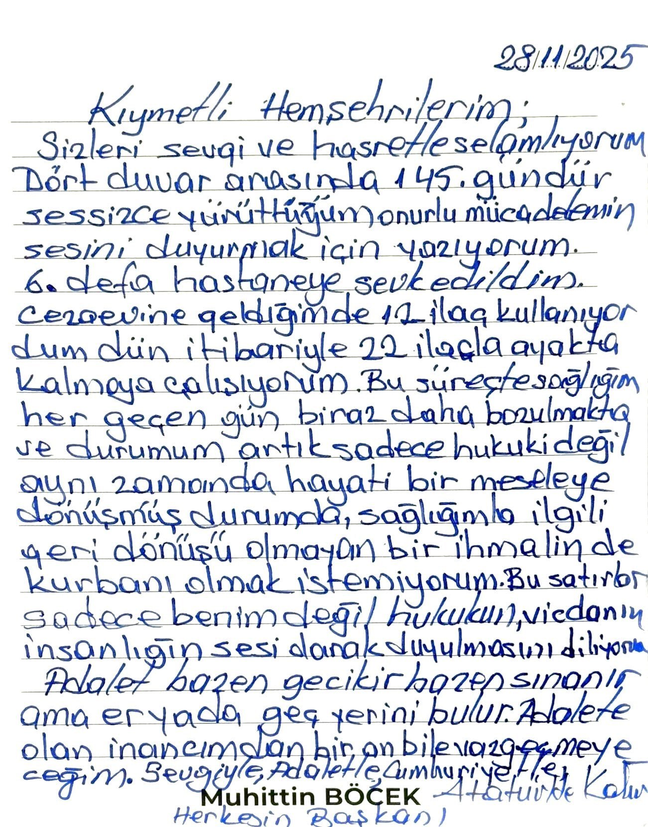 Bu satırların sadece benim değil; hukukun, vicdanın, insanlığın sesi olarak duyulmasını diliyorum. Adalet bazen gecikir, bazen sınanır ama er ya da geç yerini bulur. Adalete olan inancımdan bir an bile vazgeçmeyeceğim. Sevgiyle, Adaletle, Cumhuriyetle, Atatürk’le kalın.